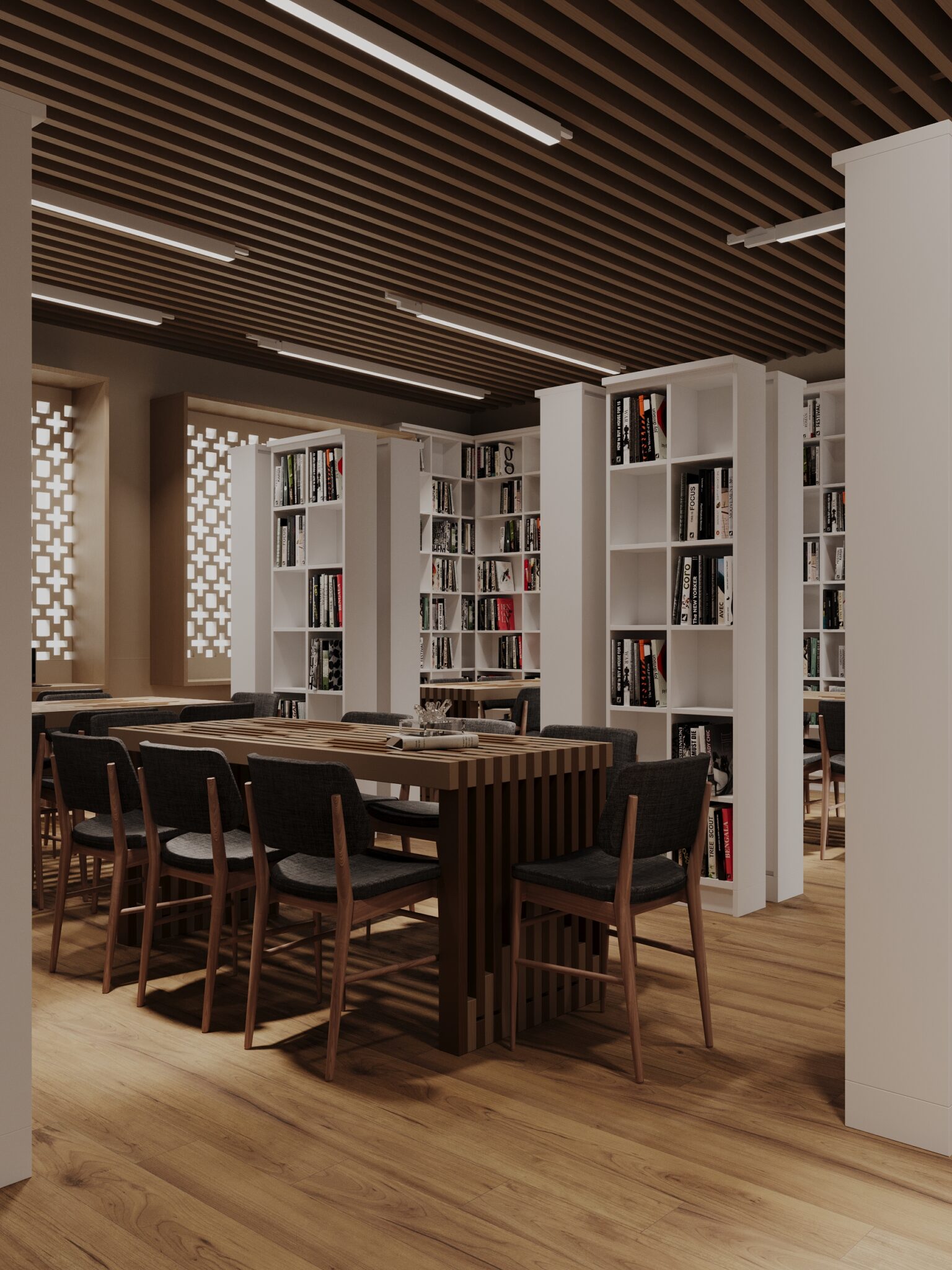 un espace de lecture individuel près de la fenêtre avec une banquette intégrée , un coin de travail collaboratif avec une grande table entourée de chaises, et un espace de rangement optimisé avec des étagères blanches.