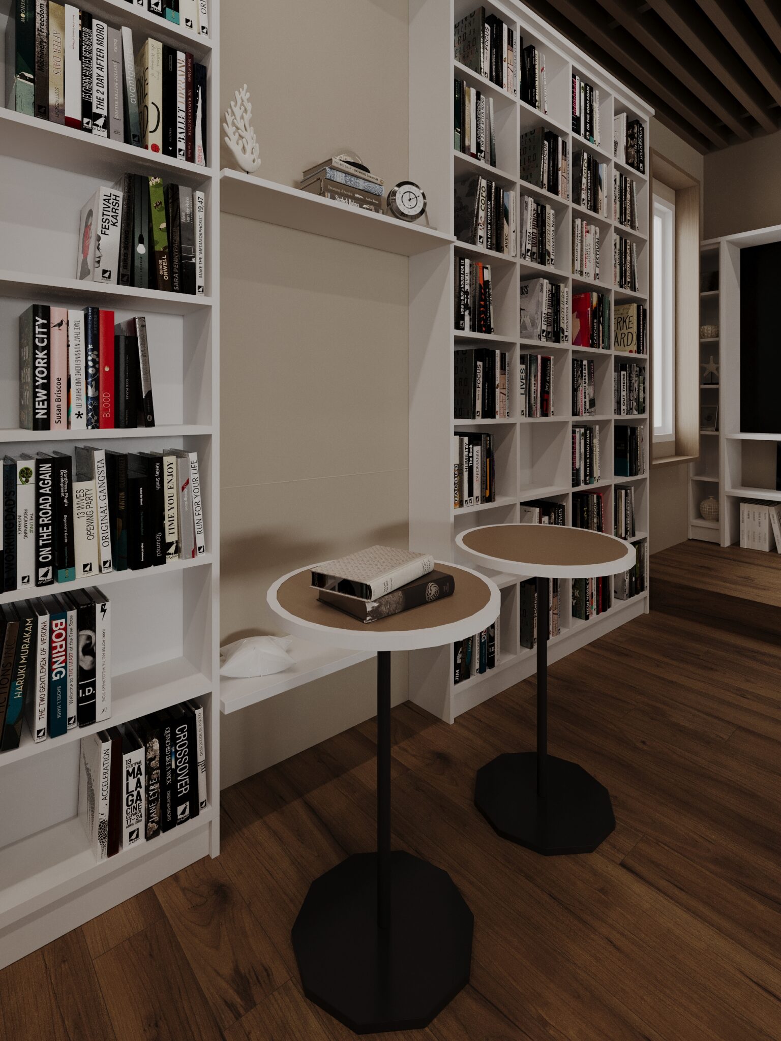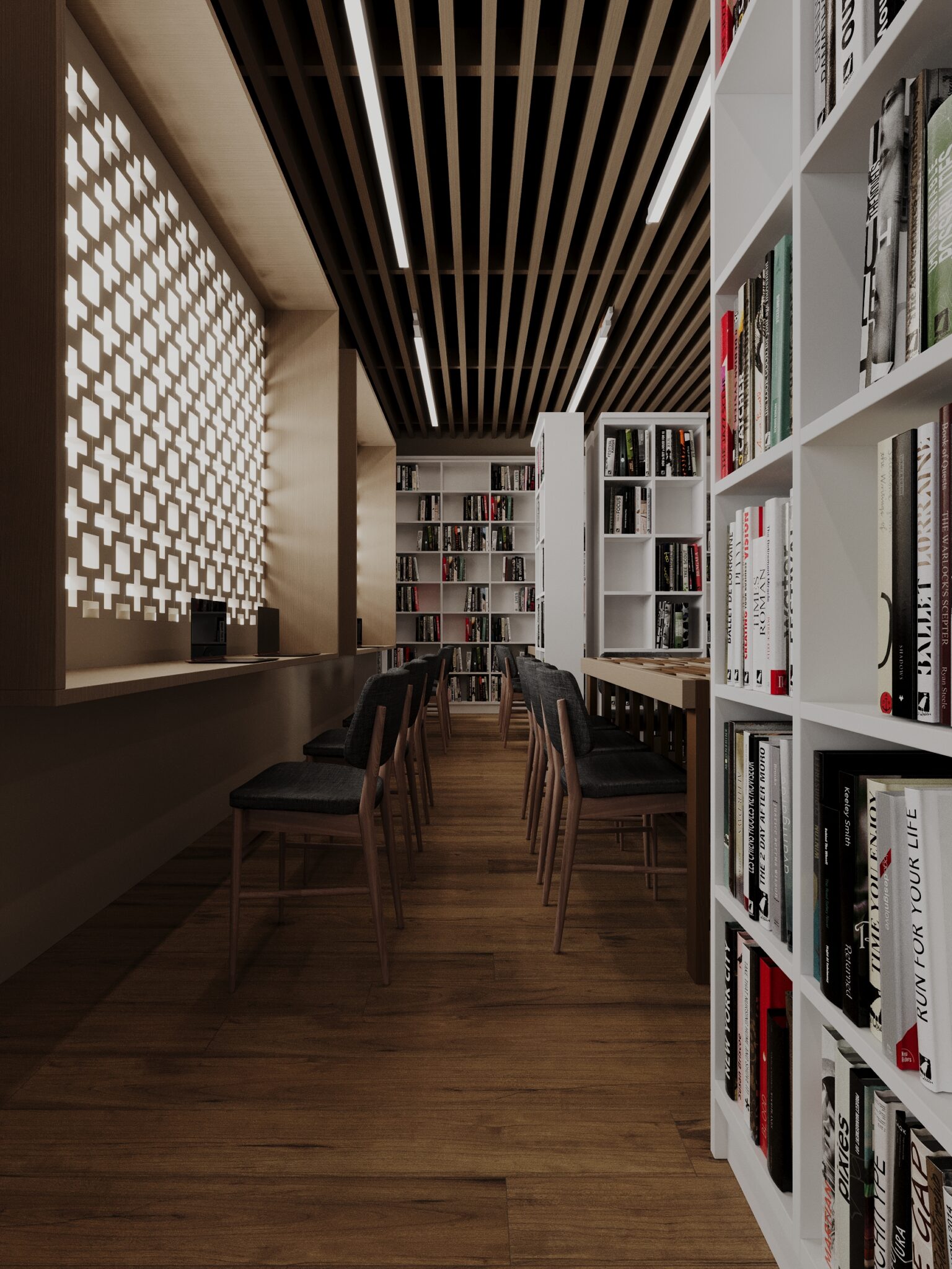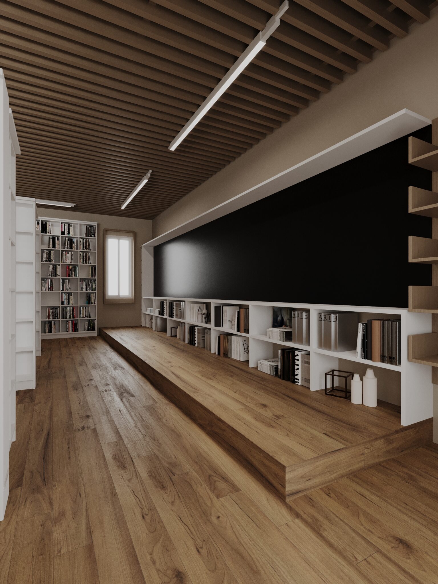 Une plateforme surélevée en bois est intégrée le long du mur principal pour créer une zone décontractée, pour un accès facile aux livres.