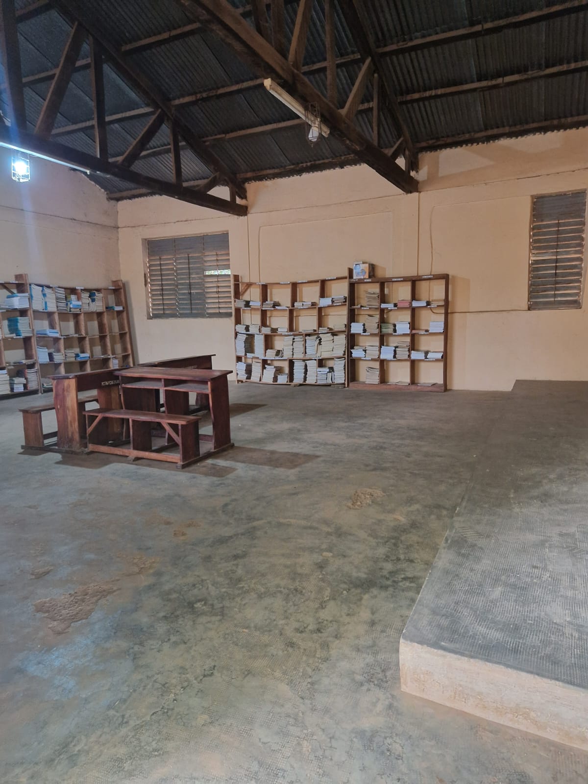La salle, d’une dimension de 8,40 m par 9,89 m, était initialement équipée de manière rudimentaire avec quelques tables, chaises et étagères murales, ne permettant pas un usage optimal pour une bibliothèque scolaire.