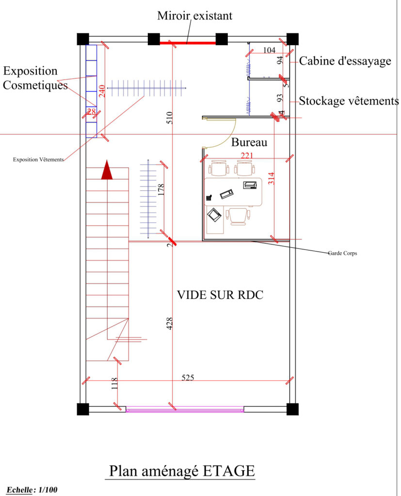 Aménagement intérieur réalisé sur deux niveaux, intégrant mobilier sur mesure, vitrines d’exposition, portants suspendus, espace de stockage optimisé, et cloisonnements légers. Les matériaux sélectionnés garantissent durabilité et esthétisme, tandis que la distribution spatiale assure fluidité des circulations et valorisation des produits dans un espace restreint.