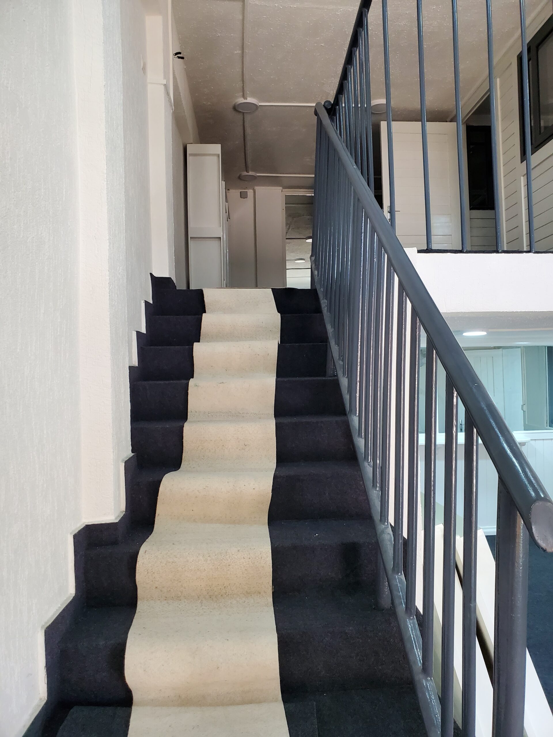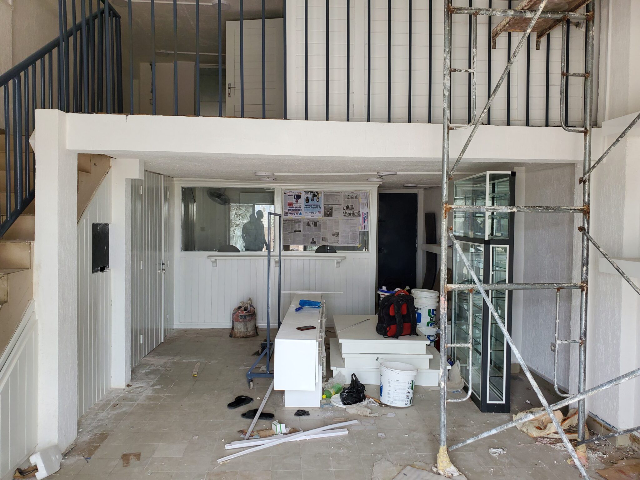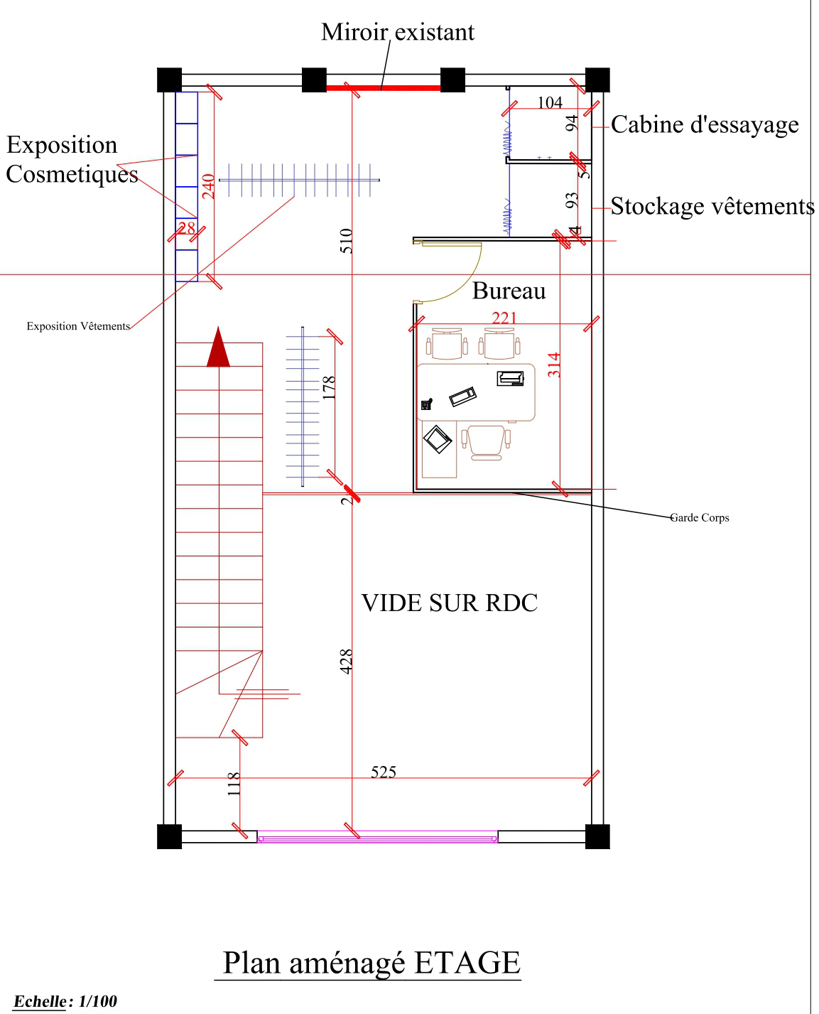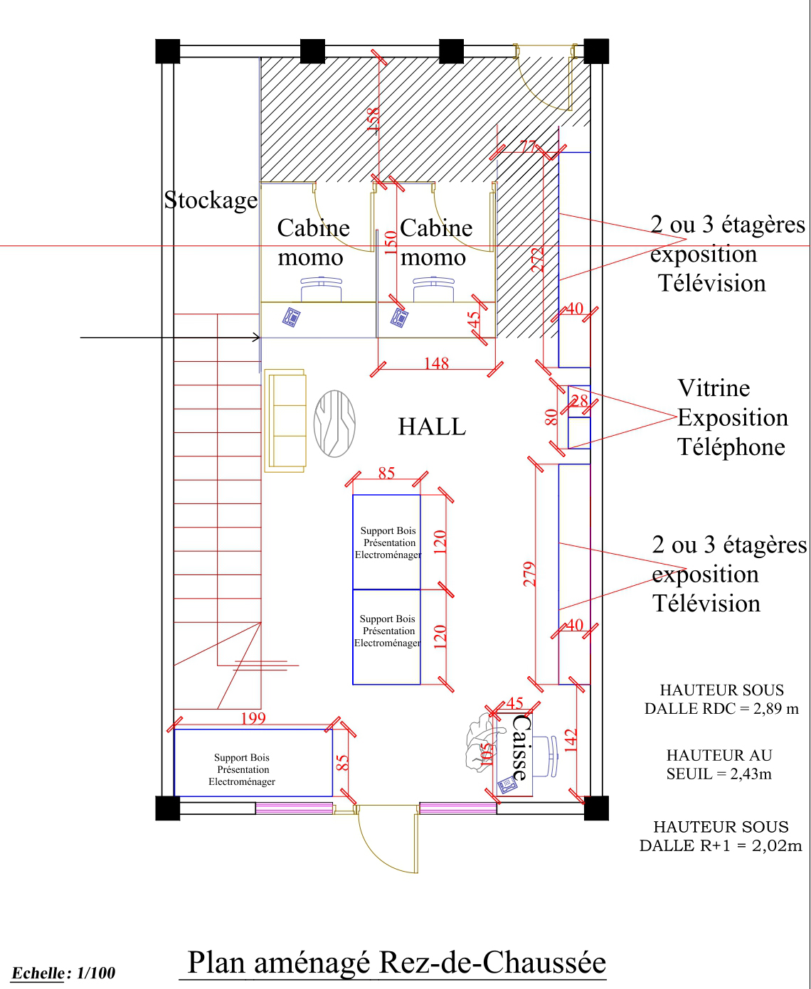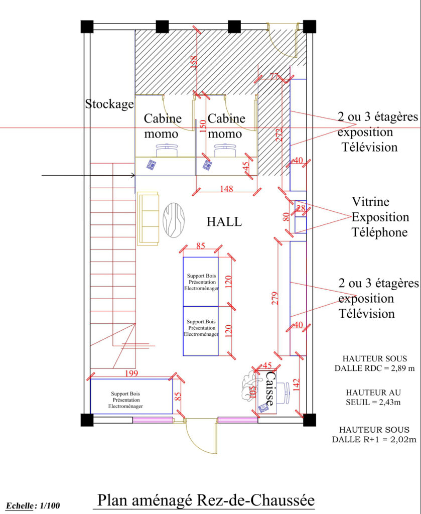 Au rez-de-chaussée : zone de vente, opérations bancaires, stockage et vitrines. À la mezzanine : bureau, exposition de bijoux et vêtements sur portants suspendus.