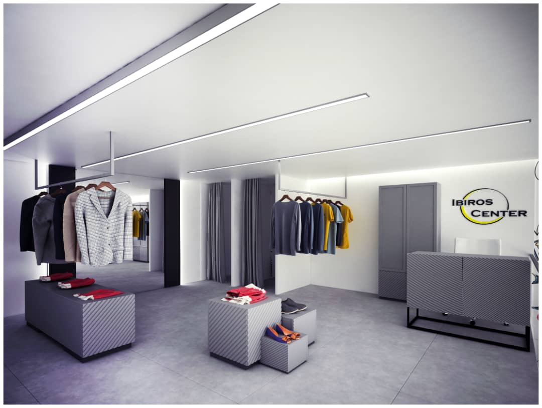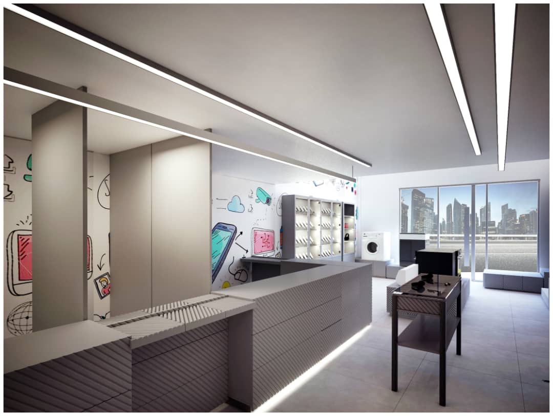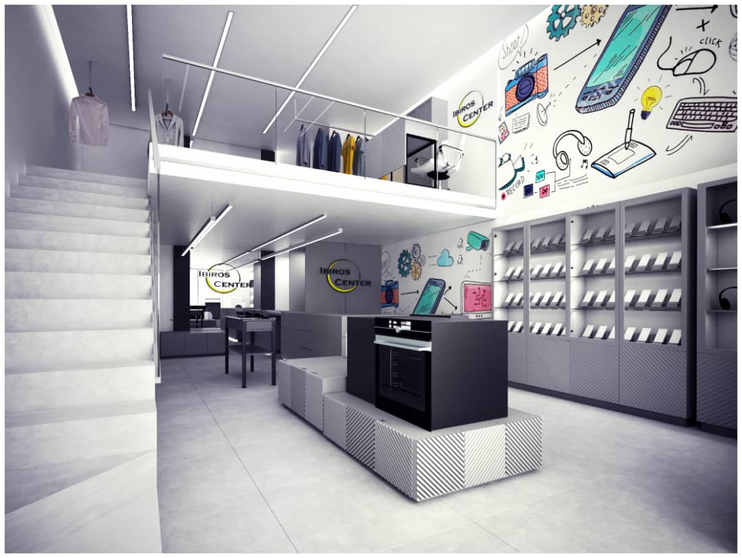 Aménagement intérieur d’un espace de vente multiproduits : électroménagers, téléphones mobiles, bijoux et vêtements.